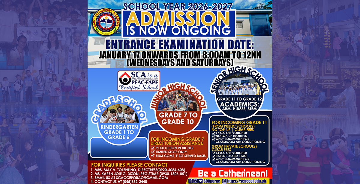 The Saint Catherine’s Academy: Center of Catholic Education, Inc. (SCA) is a Catholic Archdiocesan Educational Community centered in the person and message of Jesus Christ, animated but Gospel Values and guided by Church teachings and Practices.